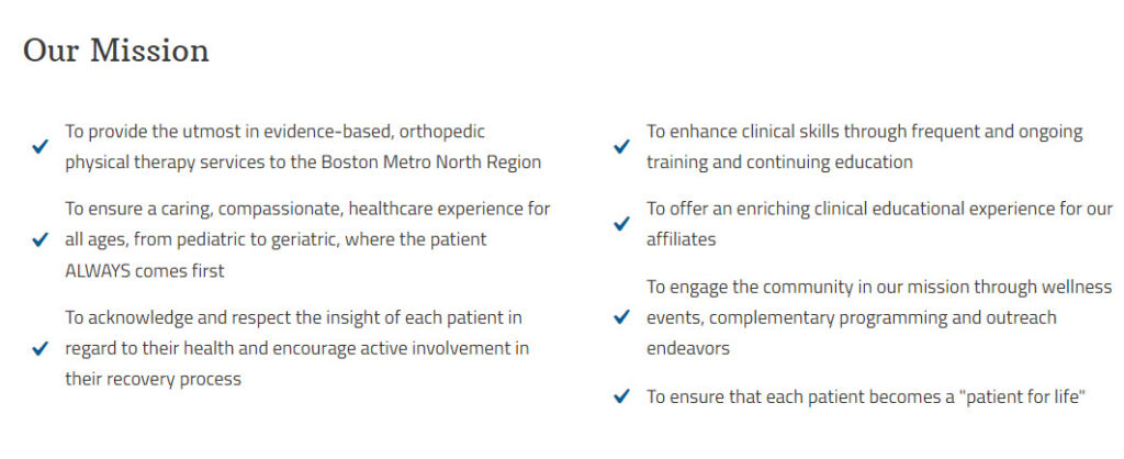 We offer a variety of PT services that aren’t offered elsewhere such as Women’s Health, Dry Needling, Alter G, etc. We pride ourselves on providing our patients with the best care possible so they become “Patients for Life.” Which means they will always come back for our PT services whenever needed throughout their life. Our Mission is as follows: